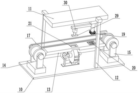 18.其中:底座10,安裝板11,支架12,操作臺13,收卷機14,放卷機15,伺服電機一16,傳動帶17,打印機構(gòu)18,裁切機構(gòu)19,裁切座20,貼標臺21,移動機構(gòu)22,伺服電機二23,夾持槽24,吸風機25,風管26,網(wǎng)孔27,收料箱28,貼標機構(gòu)29,電動伸縮桿30。
