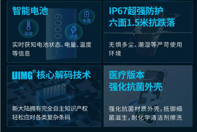 護航持續(xù)作業(yè) 智能電池 IP67超強防護 六面1.5米抗跌落 實時獲知電池狀態(tài)、電量、溫度 無懼多塵、潮濕等嚴(yán)苛使用 等信息 環(huán)境 UIMG核心解碼技術(shù) 醫(yī)療版本 強化抗菌外殼 新大陸擁有完全自主知識產(chǎn)權(quán) 強化抗菌材質(zhì)外殼,抵御細 輕松應(yīng)對各類復(fù)雜條碼 菌滋生,耐化學(xué)清潔劑擦洗 手套模式 OCR 支持 雙麥降噪 人臉解鎖 智能識別 Wi-Fi漫游 豐富外設(shè) 匹配更多應(yīng)用場景 手柄 配套手柄使用,優(yōu)化抓握使用方式,有效降低使用疲勞,提升工作效率。