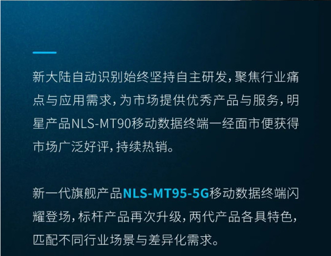 RFID OCR識讀 NFC 1300萬/800萬RFID 遠距掃碼 一/二維碼 像素攝像頭 您架 17 新大陸自動識別始終堅持自主研發(fā),聚焦行業(yè)痛點與應(yīng)用需求,為市場提供優(yōu)秀產(chǎn)品與服務(wù),明星產(chǎn)品NLS-MT90移動數(shù)據(jù)終端一經(jīng)面市便獲得市場廣泛好評,持續(xù)熱銷。